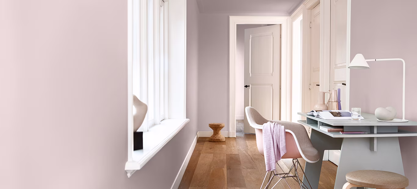 When used in combination with Sweet Embrace™, the dreamy shades in our uplifting colour story help to make this space feel joyful and energising. This two-tone scheme creates a subtle and welcoming home office backdrop.